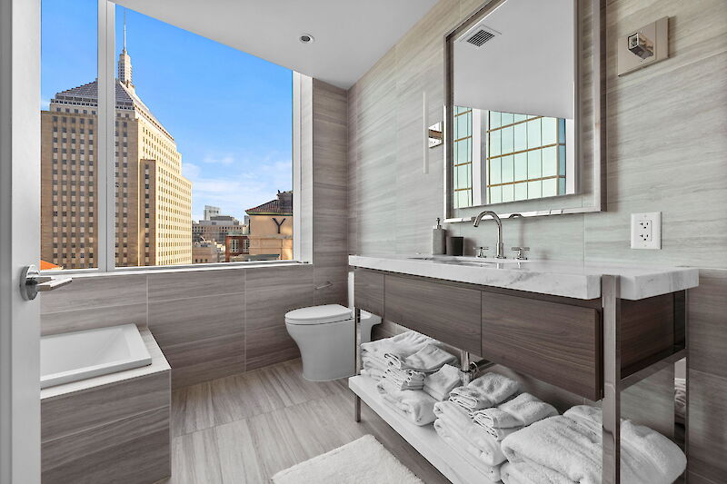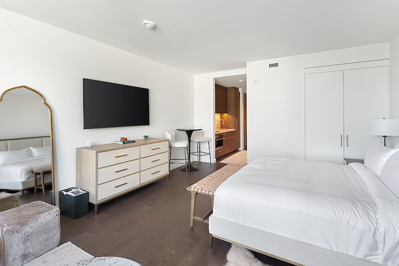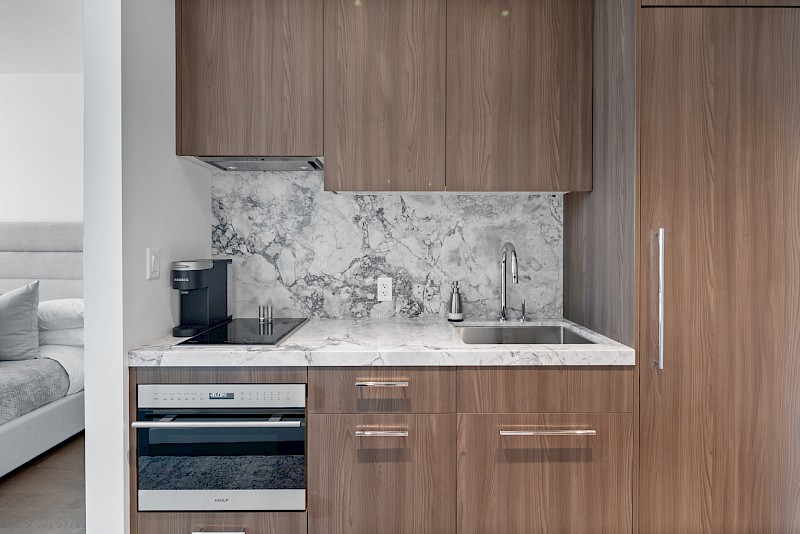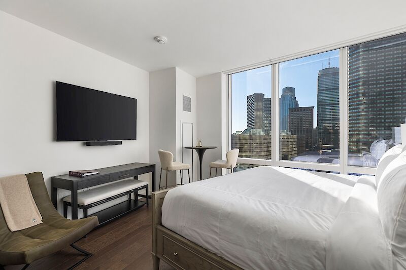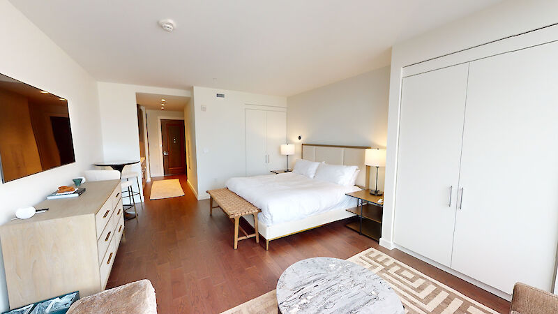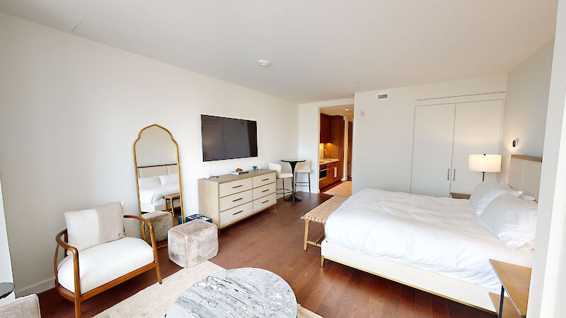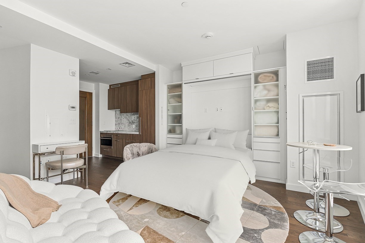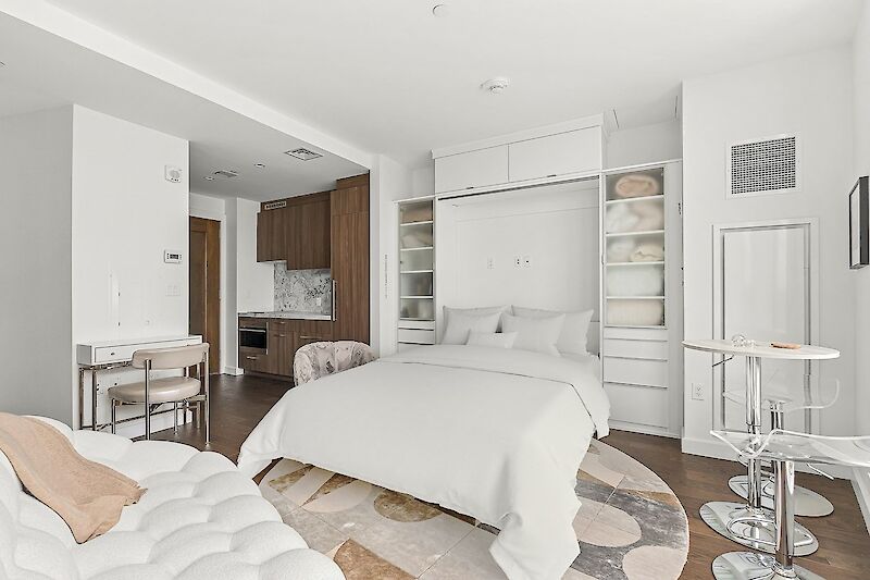full descriptionUnit 1502 offers an expansive 579 sqft of highly functional, furnished studio living, featuring floor-to-ceiling windows, queen bed, plush couch, dining table and chairs for two, six drawer dresser, wall mounted 4k tv, and comes wifi ready. Soft colors and warm tones used throughout the unit will have you feeling right at home! The fully applianced kitchen incorporates marble counters, SubZero & Wolf appliances and in-unit washer/dryer. Pamper yourself in the luxurious bathroom complete with soaking tub & glass shower.