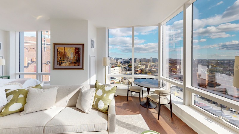 Stunning unit with panoramic views of Boston's iconic skyline and alcove with Charles River views.